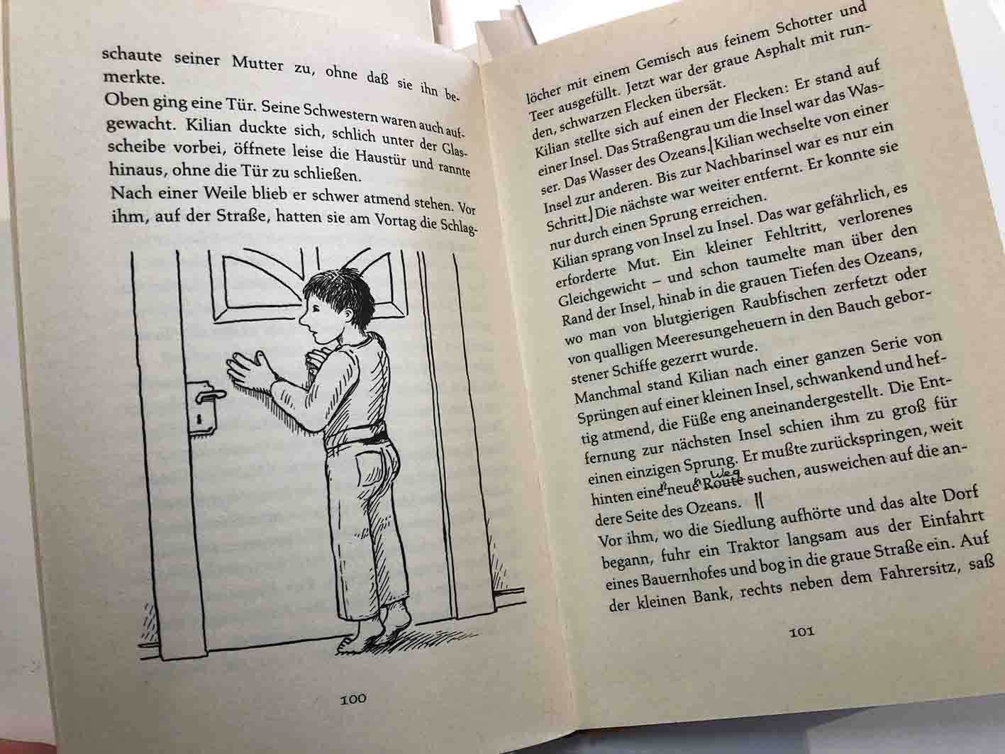Aus ‘Der Tag an dem Tante Marga verschwand und andere Geschichten‘, Verlag Friedrich Oetinger, 1986, S. 100, Flucht