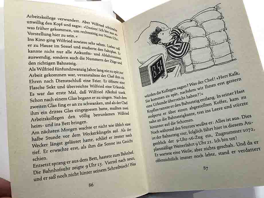 Aus ‘Der Tag an dem Tante Marga verschwand und andere Geschichten‘, Verlag Friedrich Oetinger, 1986, S. 87, Der Mann der nie zu spät kam