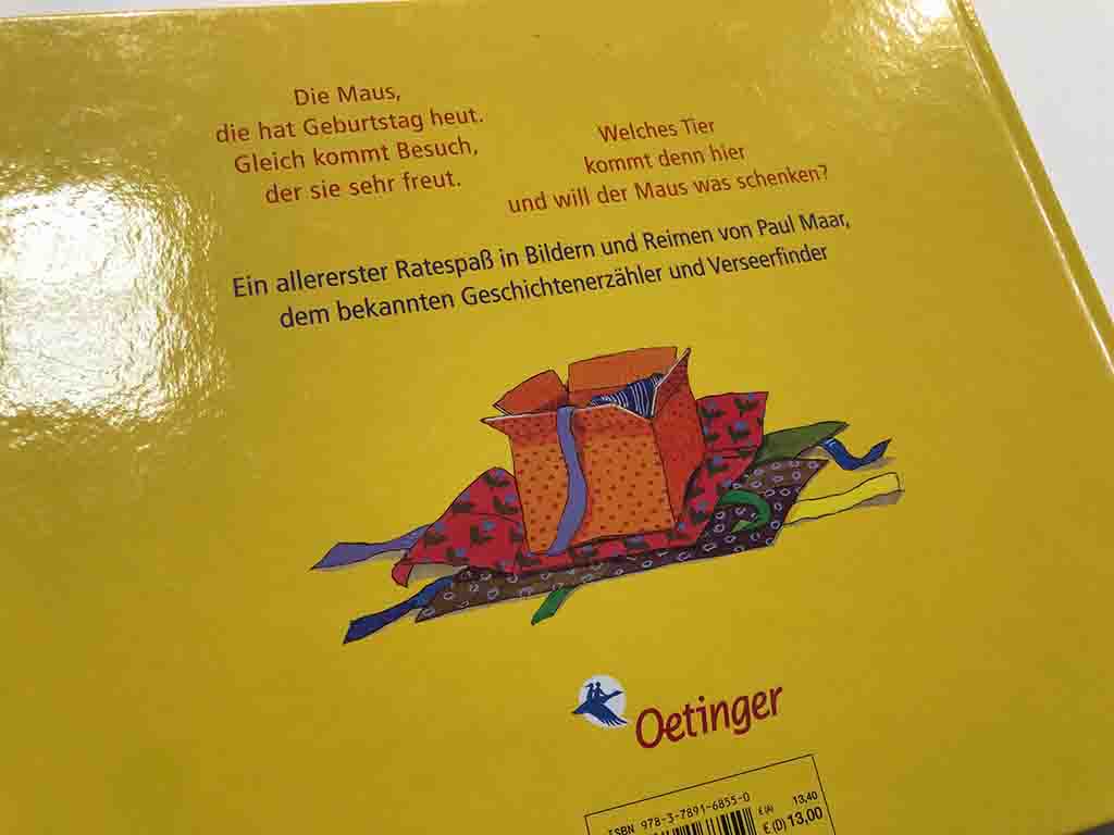 Aus ‚Die Maus, die hat Geburtstag‘ heut‘, Verlag Friedrich Oetinger, 1997, Einband Rückseite